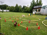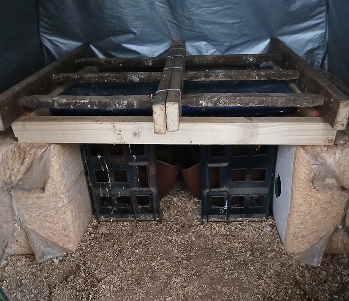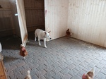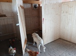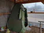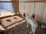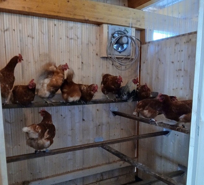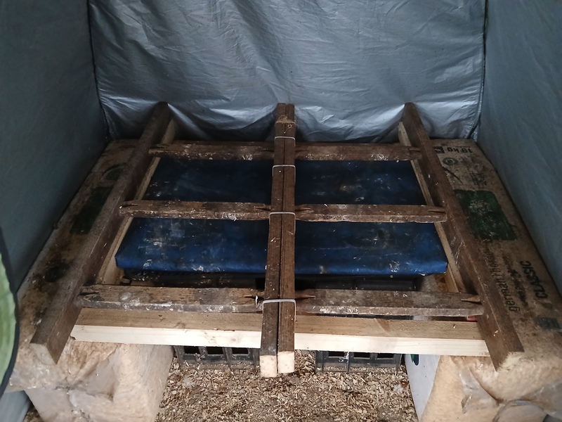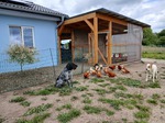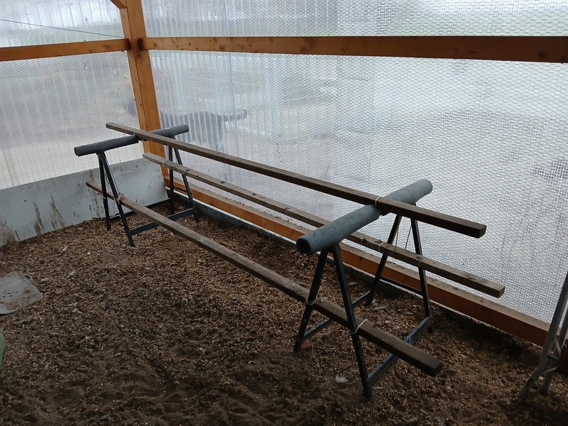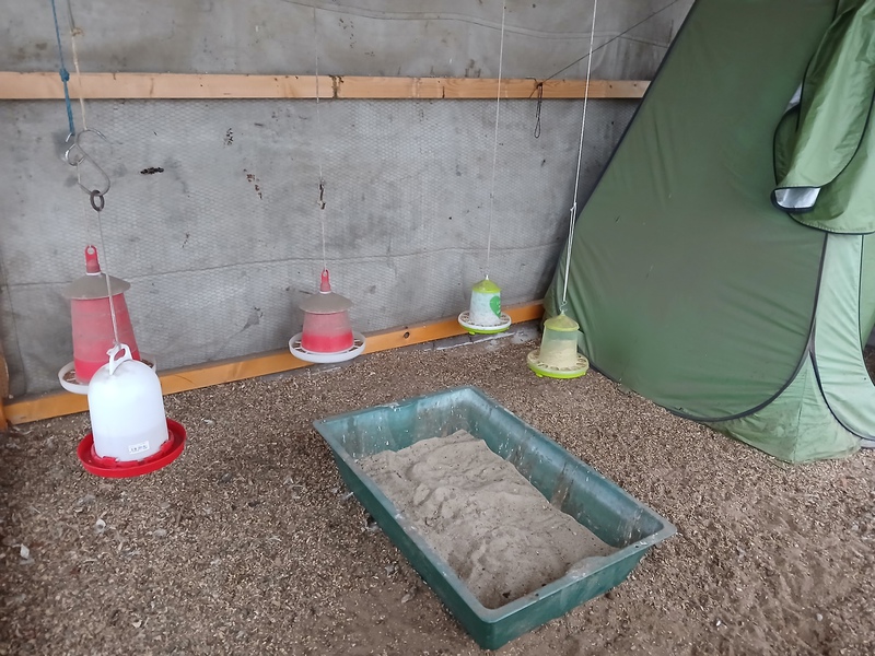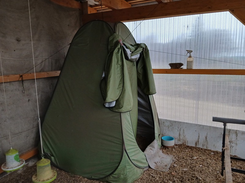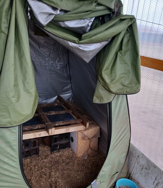 Frauchen hatte zu Corona Zeiten zum Wetterschutz für die Kunden auf dem Hundeplatz Zelte gekauft. Zum Glück werden die nicht mehr gebraucht, so wurden alle 5 Übereinander gesteckt und zum Hühnerstall umfunktioniert, der in der schönen Voliere seinen Platz gefunden hat. Alles war drin, was ein Huhn so braucht. Unten die Nester, darüber die Sitzstangen und eine Kabellampe oben an der Zeltdecke. So sind unsere Camping-Hühner gut durch den Winter gekommen. (grins)