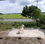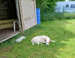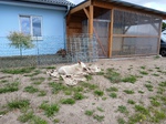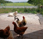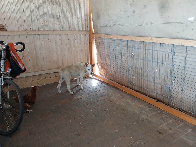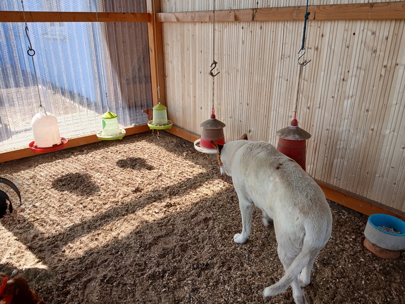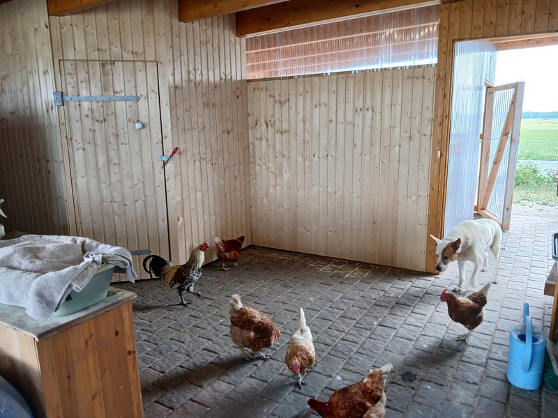 Zuhause angekommen, raus aus dem Auto, zur Küche Naschie abhole, Frauchen Auto auspacken lassen, Hühner versorgen, kleine extra Futterration und dann zu Bett bis zum Abendessen. (gähn)