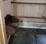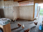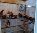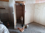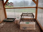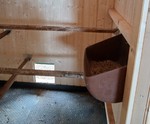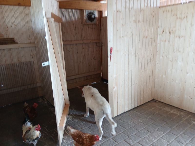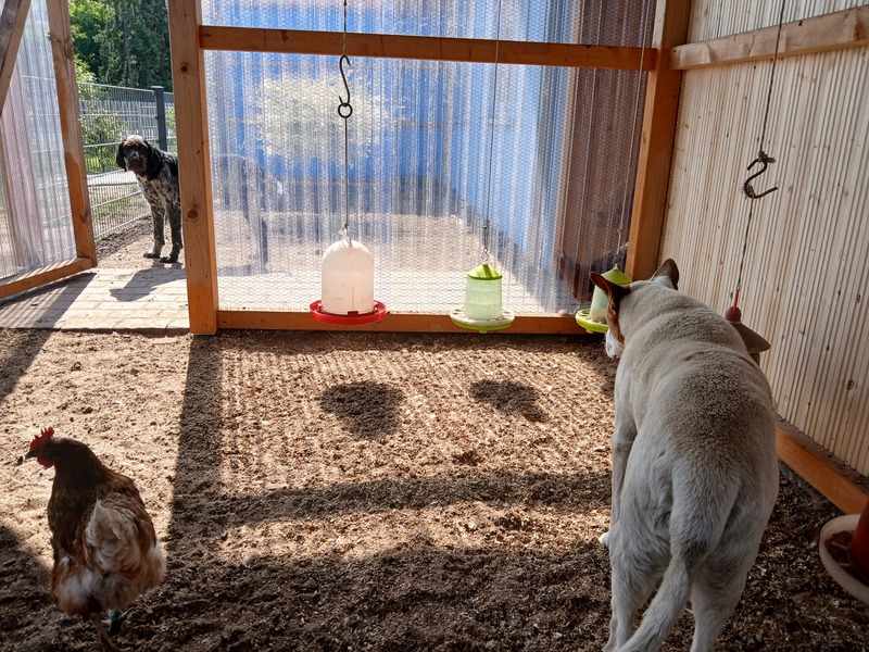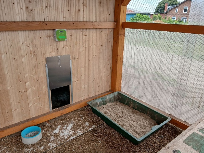 Der Zimmermann hatte die Hühnerklappe mit eingebaut, doch fehlte noch die Türautomatik. Nach ein paar Tagen, war wieder Zeit und Kraft da, so das Frauchen die Automatik anbaute, die schon über ein Jahr im Schrank lag. Es war bis jetzt ja kein Stall da, an dem sie angebracht werden konnte. (zwinker) Nun geht die Klappe wie von Zauberhand morgens um 6:30 Uhr auf und abends um 21 Uhr zu. Die Sandkiste fand ihren Platz, so wie hochgelegene Tages Sitzstangen, die bei schlechtem Wetter gerne genutzt werden. Für den Sommer ist eine Stück Lichtplatte nach Osten auf, womit immer auch frische Luft hereinkann.