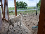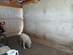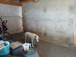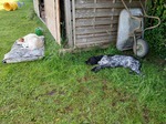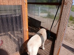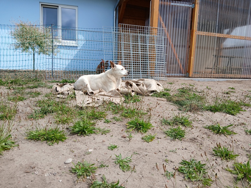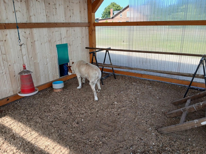 Auch die große Zeltplane schubste sie schon Richtung Voliere und sicherte mit übriggebliebenen Gittern vom Zaun die Voliere ab, weil an dem Tag die Mädels in der Voliere bleiben sollten.