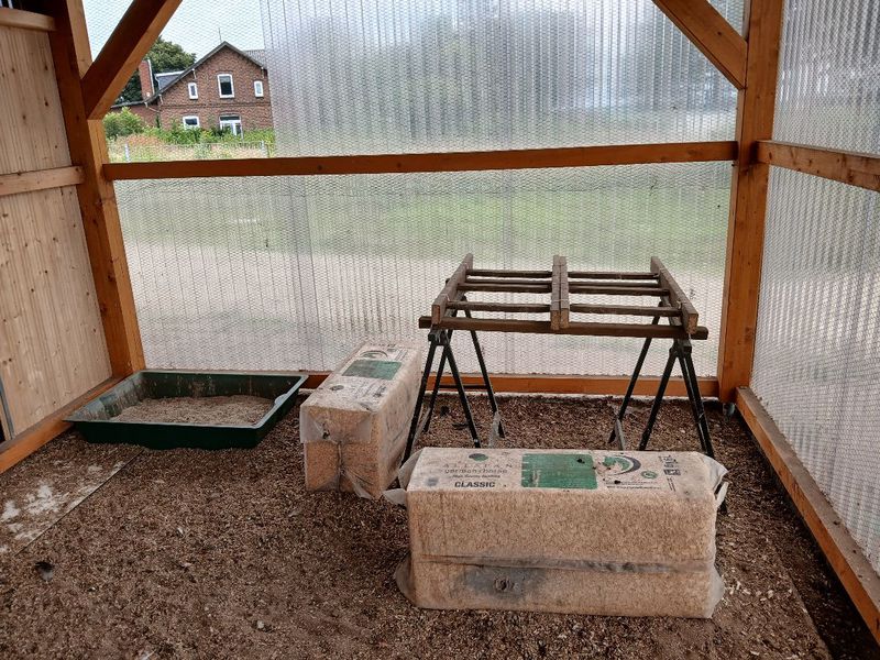 Die Plastikplane an der Voliere musste runter. Wir hatten feststellen müssen, dass das ganze Jahr der Wind auf die Voliere steht und keine geschützte Ecke für unsere kleinen da war. So wurde provisorisch eine Plane angebracht.
