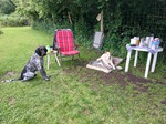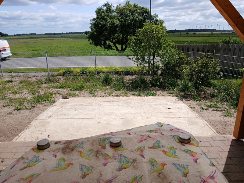 Wären der Arbeiten flog die Zeltplane raus auf das Grundstück, was ich für sehr gemütlich fand. Das brachte Frauchen auf die Idee, sie dort auszubreiten, wo mal der Rasen hinsoll, was leider noch nicht geklappt hat. Doch der Ersatzrasen ist prima. Ich liebe es dort in der Sonne zu liegen. (strahl)