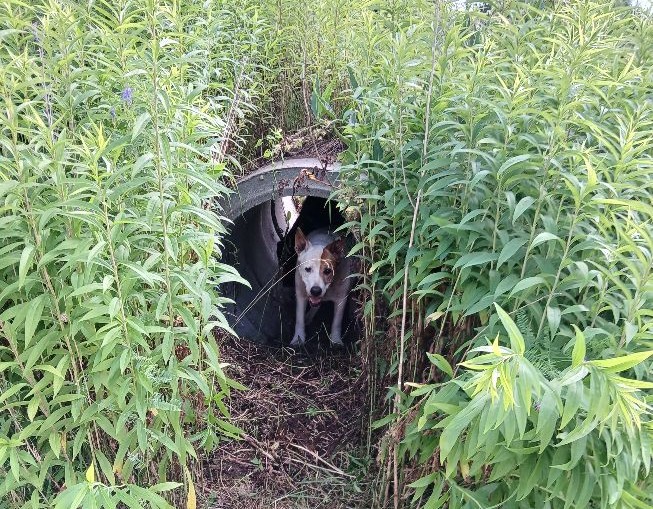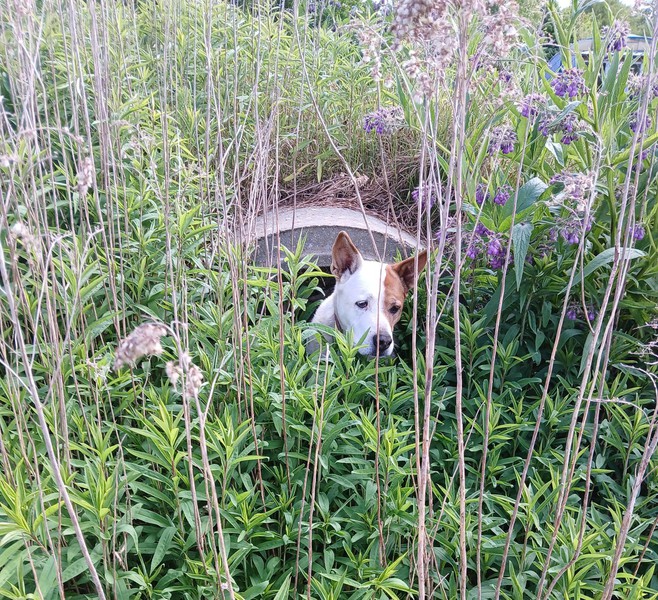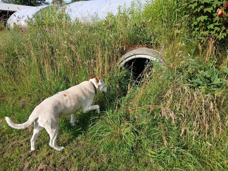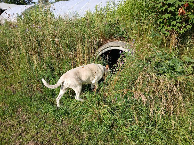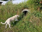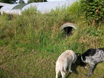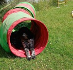 Auf unserem Hundeplatz ist auf dem Spielplatz ein Hügel, in dem sich ein Tunnel befindet. Der Eingang ist gut frei, doch der Ausgang!? (schmoll) Als gar nichts mehr ging, griff Frauchen zur Gartenschere und machte den Ausgang wieder frei. Ach, ist das schön, ich liebe mein Frauchen! (Hundekuss)