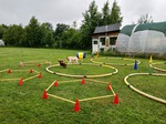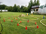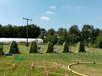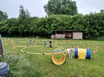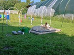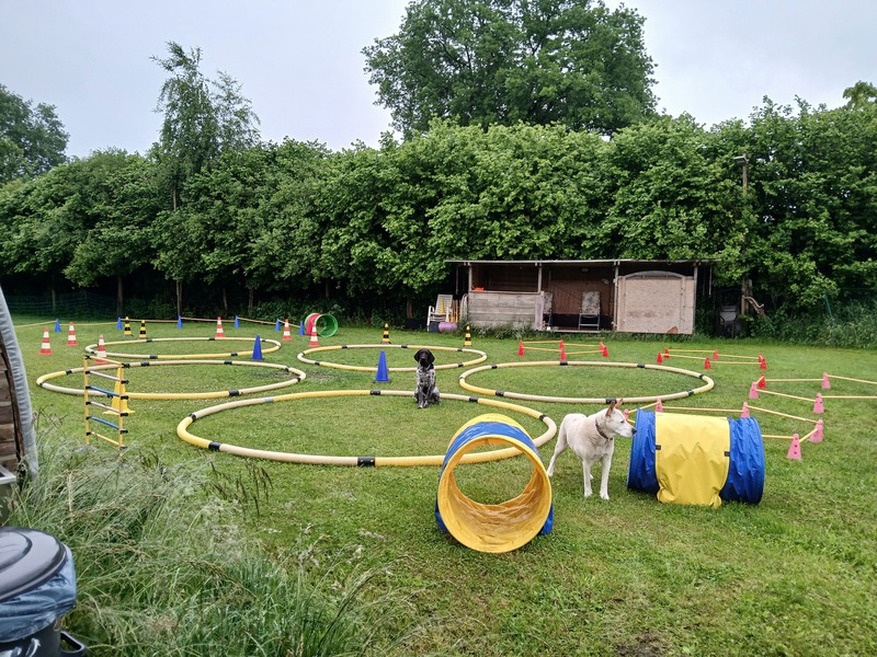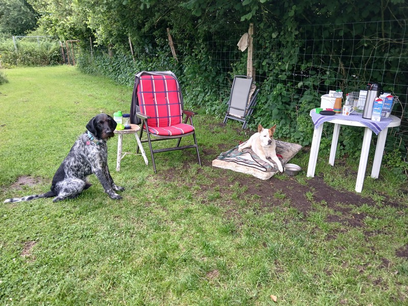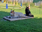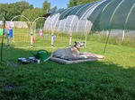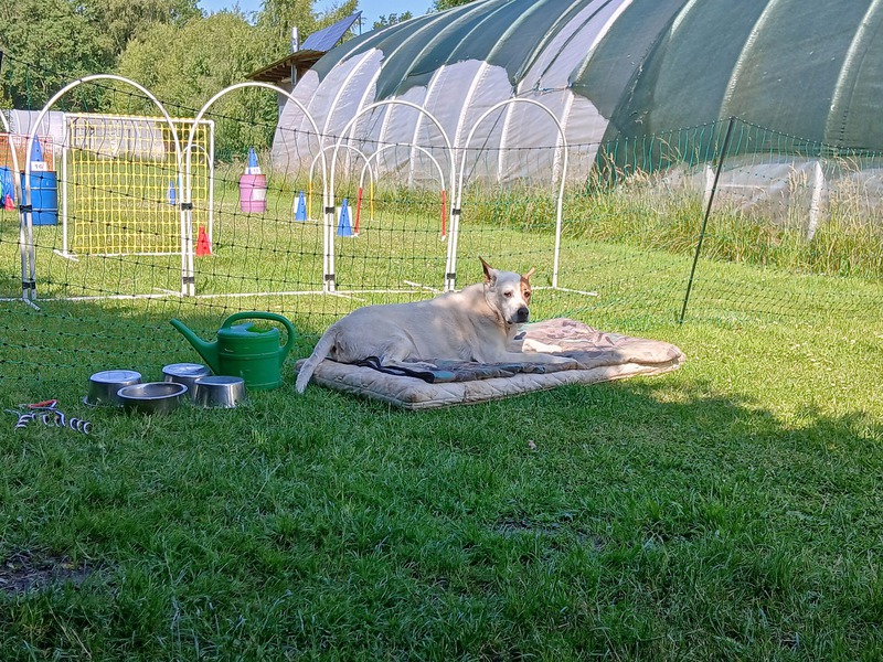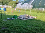 Wenn alle weg sind, merke ich, aber auch Felli, wie müde wir eigentlich sind. Doch Donnerstag und Sonntag ist für Frauchen noch umbauen angesagt. Von Hoopers zu Longieren (Donnerstag) oder umgekehrt (Sonntag). Wir zwei legen uns schon für die erste Runde zum Schlafen hin, was Frauchen mit liebevollen Augen beobachtet. Mein Bettchen bringt sie mir auch vor unsere Wetterhütte, oder bei schlechterem Wetter in die Hütte. Sollte es zu doll werden mit Regen, ist auch noch ein Eckchen für Frauchen frei. (kicher)