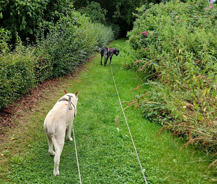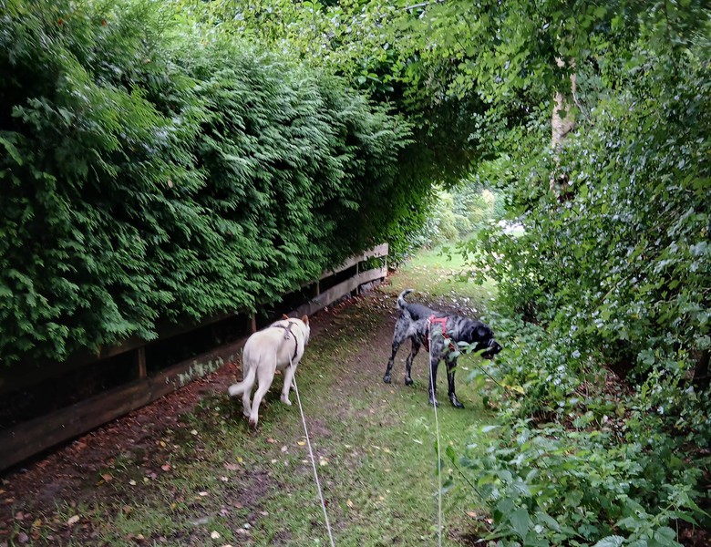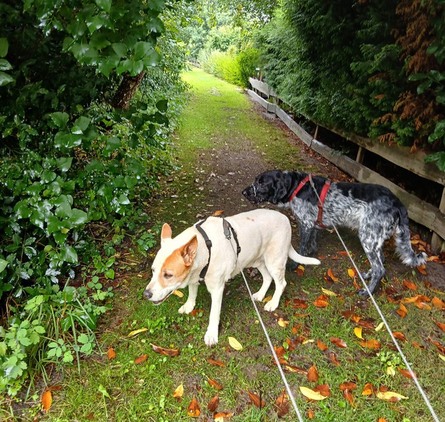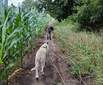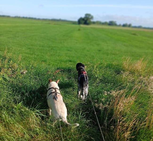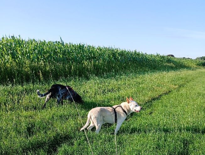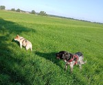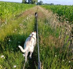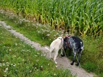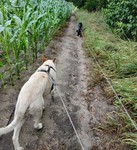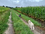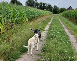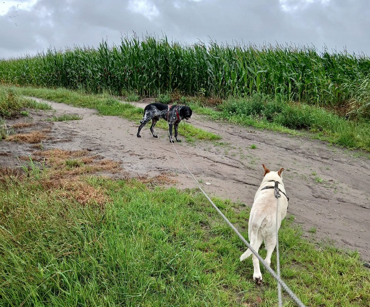 Montag und Freitag haben wir Frei. Da geht es Montag die Allee hinunter in die Wiesen und Freitag zum Deich. Das kennt ihr ja schon. Doch Mittwoch, wo abends noch Hoopers ist, gehen wir nur eine kleine Runde um eine Maisacker. 300m von uns geht ein kleiner Weg ab, der uns über einen Schleichweg zwischen zwei Acker auf eine Wiese bringt, die hinter dem Mais entlangführt.
