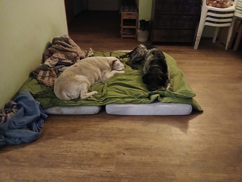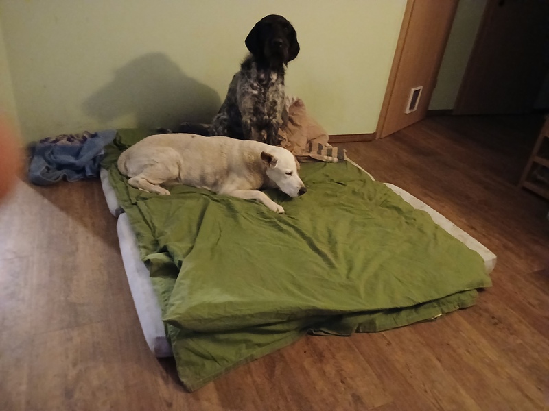 Er hatte keine Schmerzen, wurde nur immer ruhiger und schwächer. So habe ich zwei Hundebetten zusammengeschoben und wir haben die letzte Nacht zusammen darauf verbracht. Einige Male habe ich ihm nach draußen geholfen für ein kleines Geschäft.